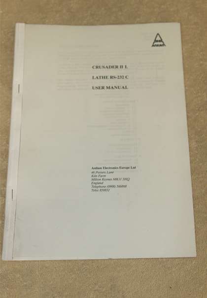 Crusader 2L Lathe RS232C User Manual..... Approximately 21 pages, dealing with, specifications, transmit and recieve, data format, general rules, input character format, G code list, example program, transfer of data, cable connections.......